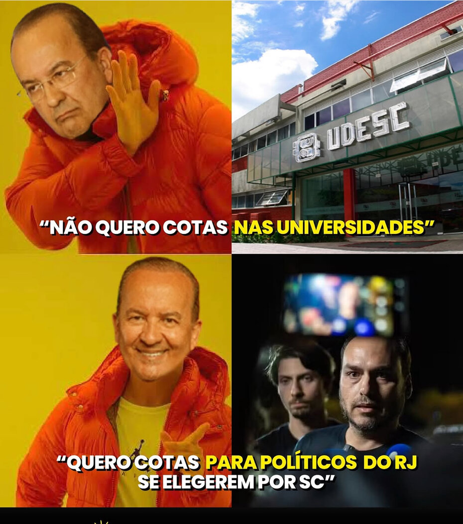 # O governador, tem tanta coisa que virá a tona na campanha, gastos exorbitantes nas bolsas de estudos, para alunos que não são carentes, o rolo, o absurdo de verbas enviadas a comunidades terapêutica, que o MP, assim como o TC-SC, já estão de olho. Agora ele como aquela turma de direita da ALESC, resolveram acabar com as cotas raciais em Universidades Públicas do Estado. Às vezes eu chego a pensar que o governador, pensa que é, presidente de um País, que não é o Brasil!